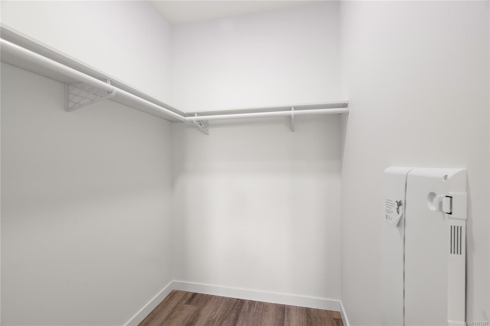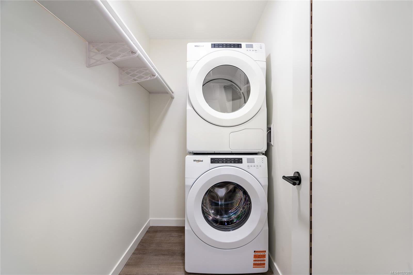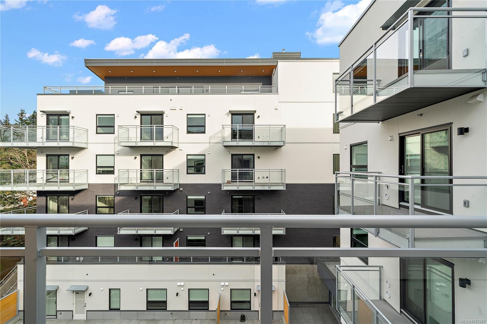 Move-in ready!! Welcome to Unit 404 in the Adamo building perched up on the 4th floor overlooking the scenic courtyard. This thoughtfully designed 1 bed, 1 bath unit offers a functional layout, both for everyday living & easy entertaining. Finished in the sophisticated Caligo colour scheme, the interior features rich contemporary tones paired w/ quality craftsmanship throughout. Built by award-winning GT Mann Contracting with interiors by Spaciz Design, the home includes quartz countertops, eat-in kitchen island, premium appliance package, heated bathroom flooring, fireplace, & heat pump w/ cooling for year-round comfort. Residents of The Proxima enjoy access to thoughtfully designed amenities including a fully equipped gym, inviting atrium, & beautifully landscaped courtyard. Just moments from Saxe Point Park, local breweries, Esquimalt Market, shopping, & the Archie Browning Sports Centre, this location offers vibrant, walkable living with nature close by. Parking & storage included.